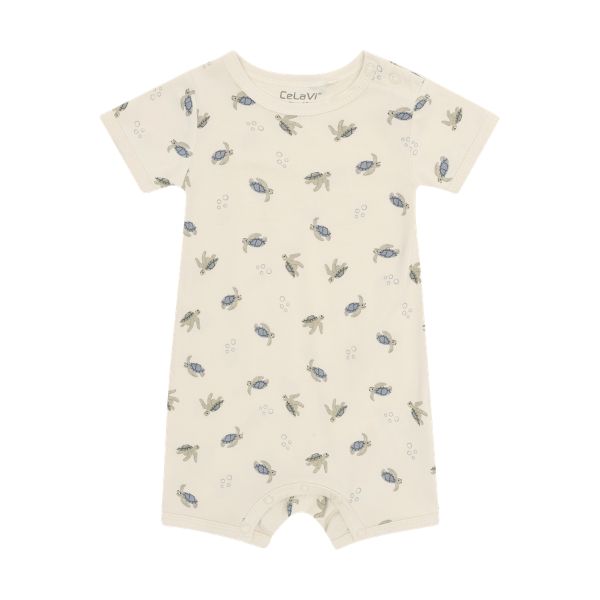 Tuta CeLaVi con stampa all-over realizzata in morbido tessuto elasticizzato, ideale per garantire comfort e libertà di movimento. Il modello con maniche corte e gambe corte è perfetto per la stagione calda e per l’uso quotidiano.