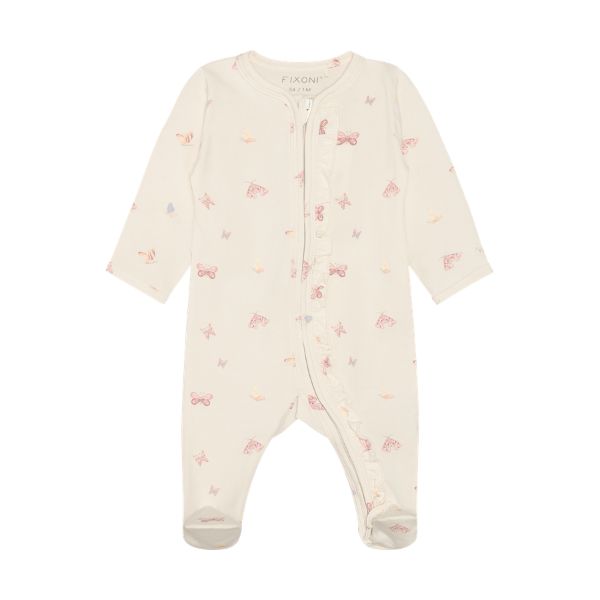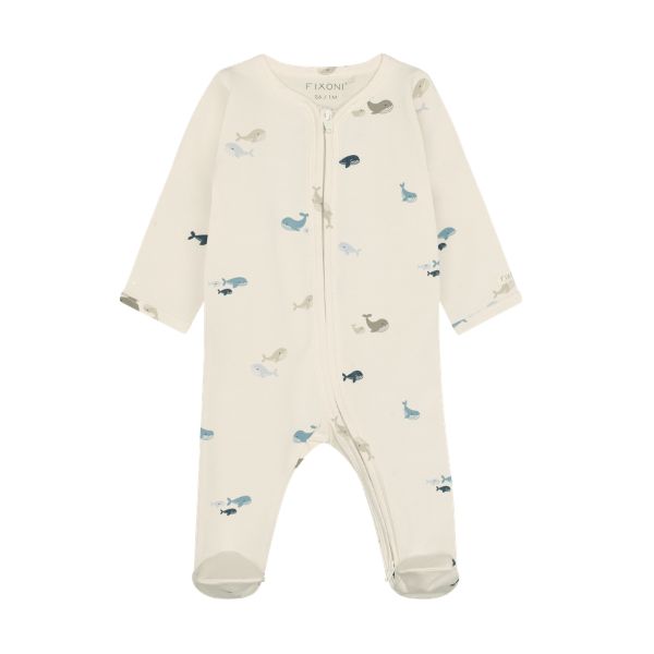 Tuta FIXONI con stampa su tutta la superficie e piedi, realizzata in morbido cotone biologico certificato GOTS. La chiusura frontale con cerniera facilita l’indossamento e la rimozione, garantendo praticità e comfort per il bambino.