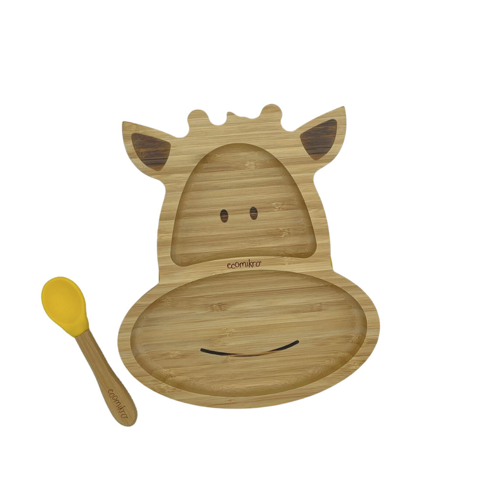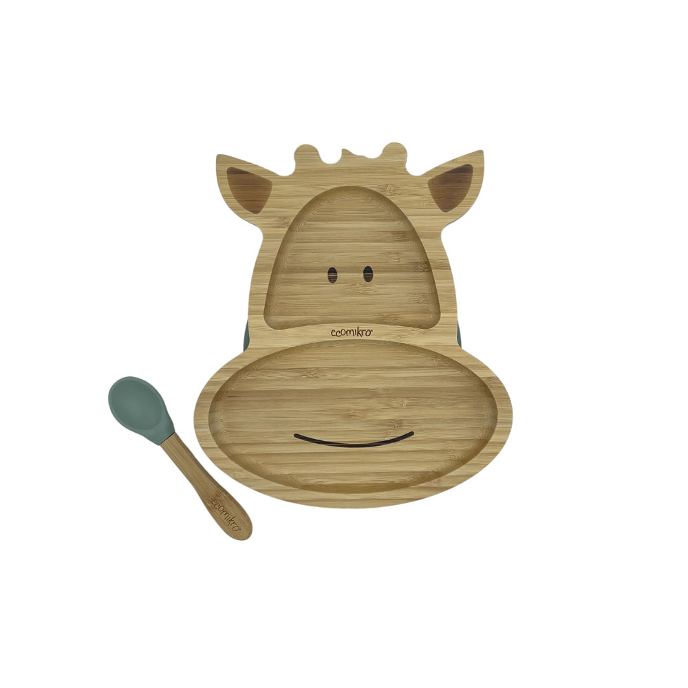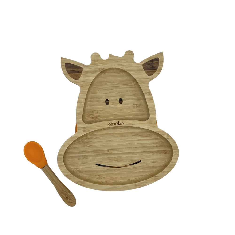 Il piatto giraffa in bambù di Ecomikro ha una ventosa rimovibile che garantisce l’aderenza al seggiolone o al tavolo.
