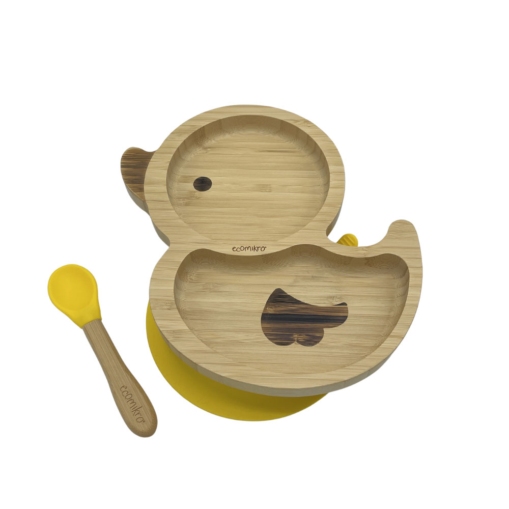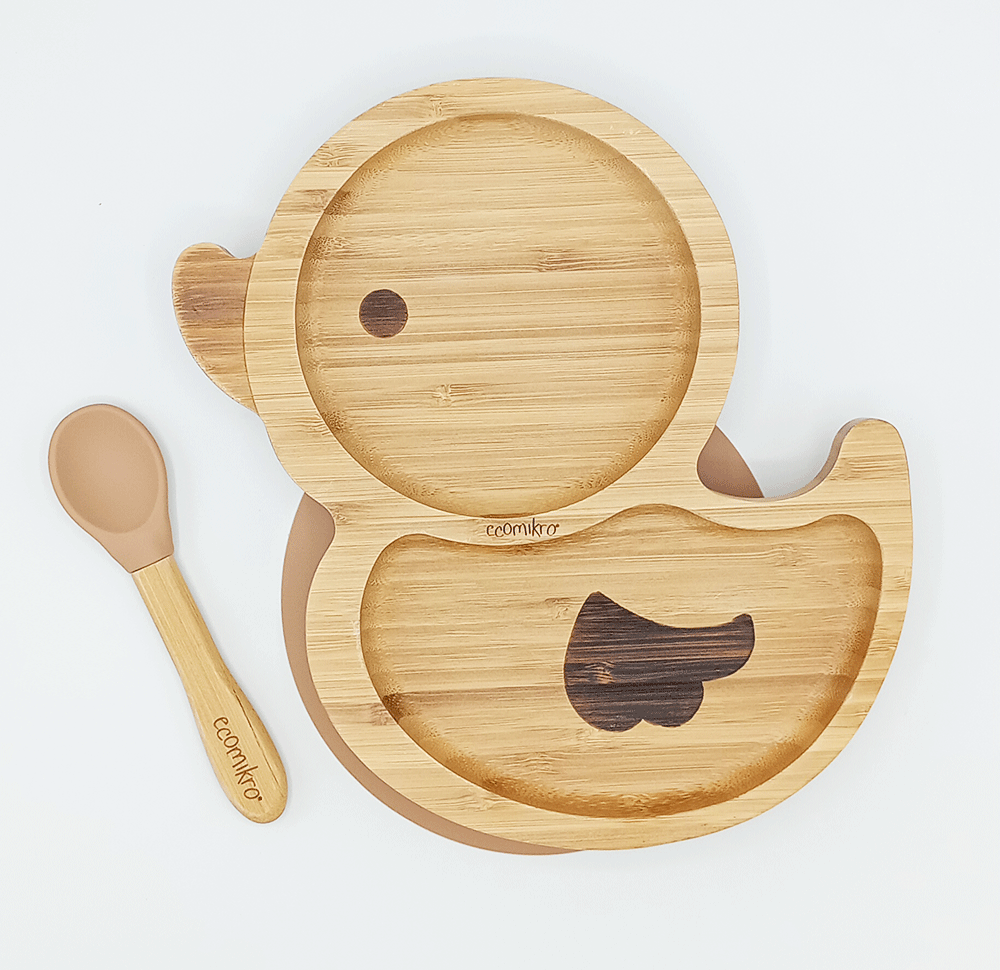 Il piatto papera in bambù di Ecomikro ha una ventosa rimovibile che garantisce l’aderenza al seggiolone o al tavolo.