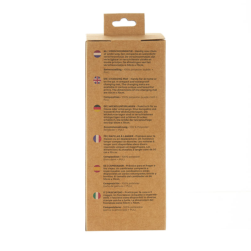 E’ composta in due strati: quello superiore a fantasia che è impermeabile, mentre quella inferiore in morbido velluto 100% poliestere riciclato e certificato GRS.